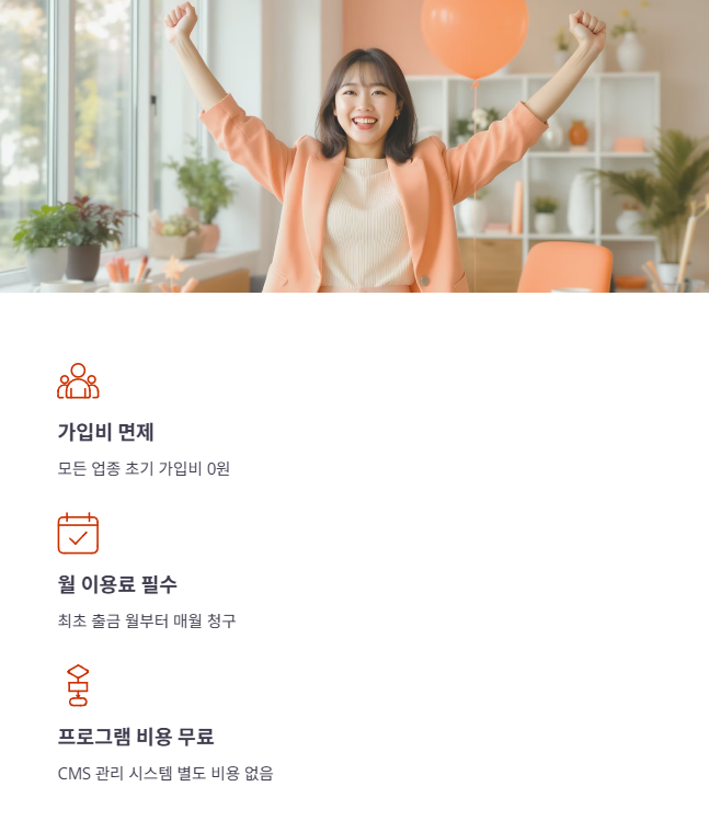 초기 가입비: 더빌 CMS는 모든 업종에서 가입비를 면제하여 초기 부담이 없습니다.
