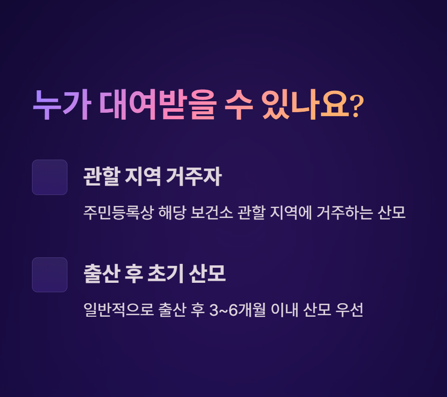 "관할 보건소"에 거주하는 출산 산모가 대여 대상입니다.
