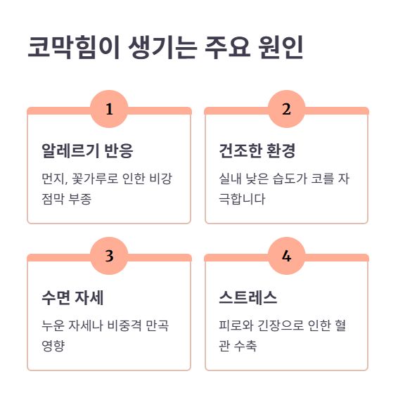 코막힘은 단순 감기뿐 아니라 다양한 생활습관과 환경 요인에서 비롯됩니다.
