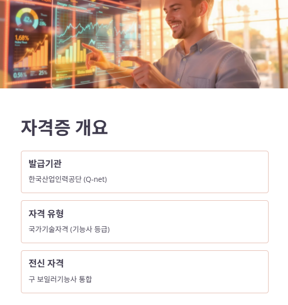 이 자격은 과거 ‘보일러 기능사’ 자격증이 통합되어 현재 명칭으로 운영되고 있으며,산업·건물·발전시설 등 에너지를 다루는 모든 현장에 필수 자격으로 자리 잡고 있습니다.