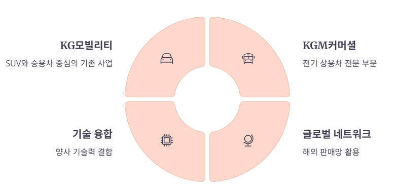 시너지 창출: KG그룹의 자금력과 KGM의 생산 인프라, KGM커머셜의 기술력이