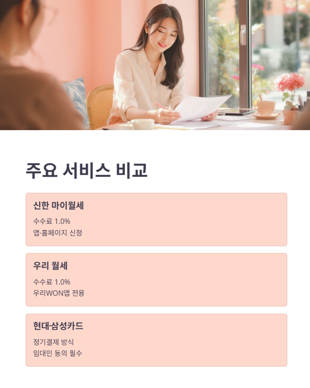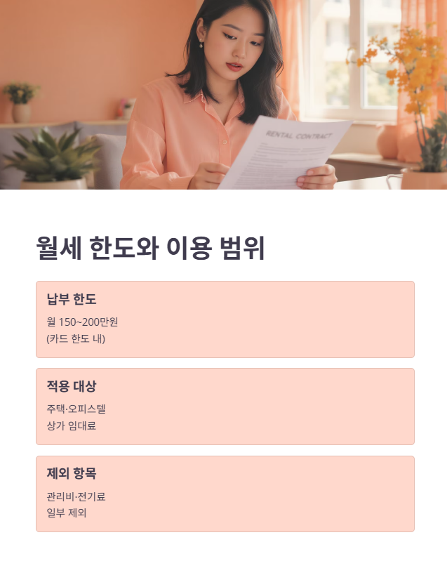 | 수수료율 | 카드사 서비스 이용 시 월세 금액의 약 1.0% 적용 | 당장 현금 없이도 납부일 유동성 확보 |