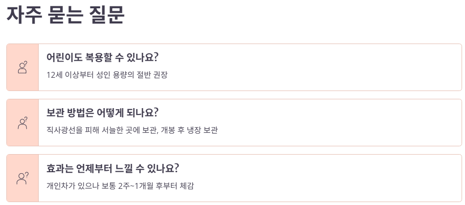 | 복용 방법 | 1일 1~2회, 식후 복용 | 꾸준함이 중요, 따뜻하게 |