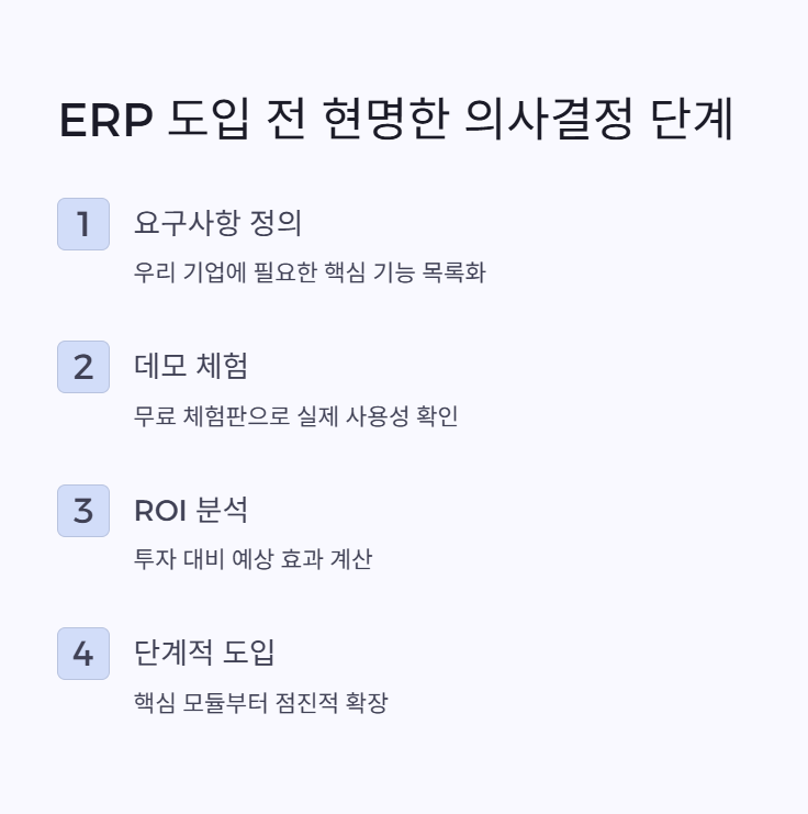ERP 도입 전 "필요한 기능과 규모"를 정확히 파악해야 해요.