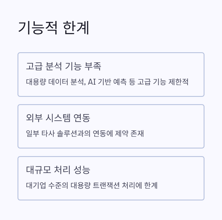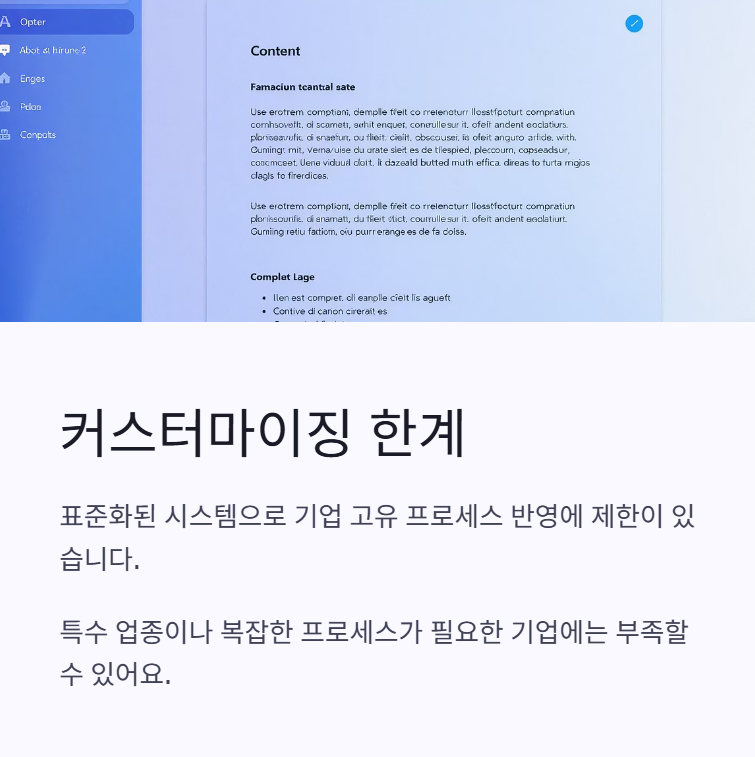 기성 솔루션이라 "기업 특유의 복잡한 요구사항"을 반영하기 어려울 수 있어요.