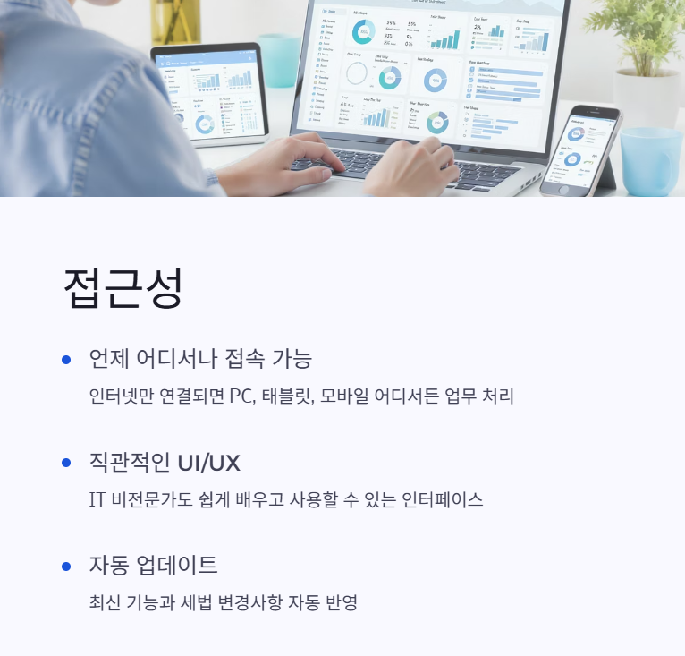 | 시스템 특징 | 클라우드 기반, 웹 접속, SaaS 형태 | 인터넷 환경 필수 |