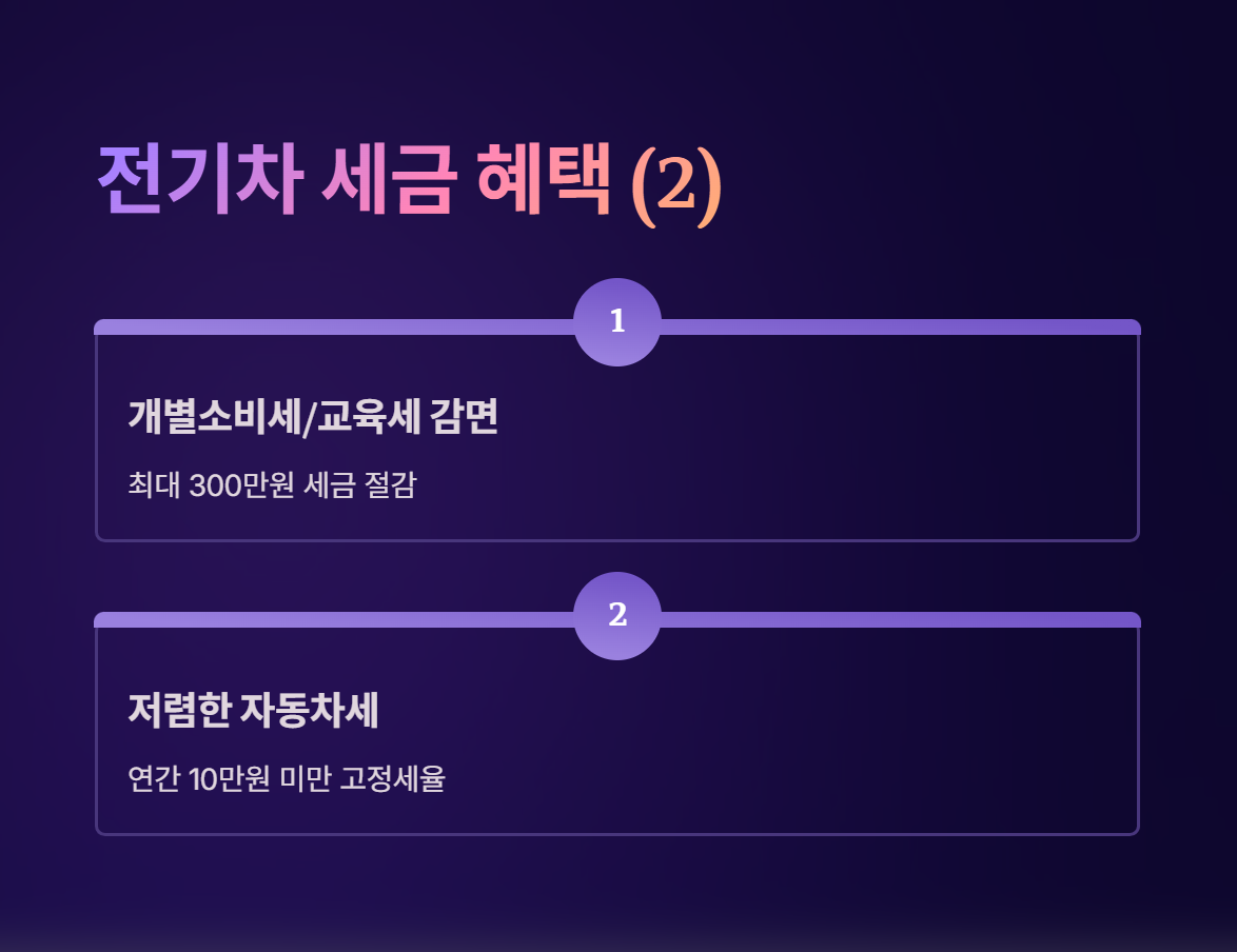 | 전기차 | 취득세 감면, 개별소비세 감면, 자동차세 저렴 | 지방세 감면은 지자체 조례 확인 필요 |