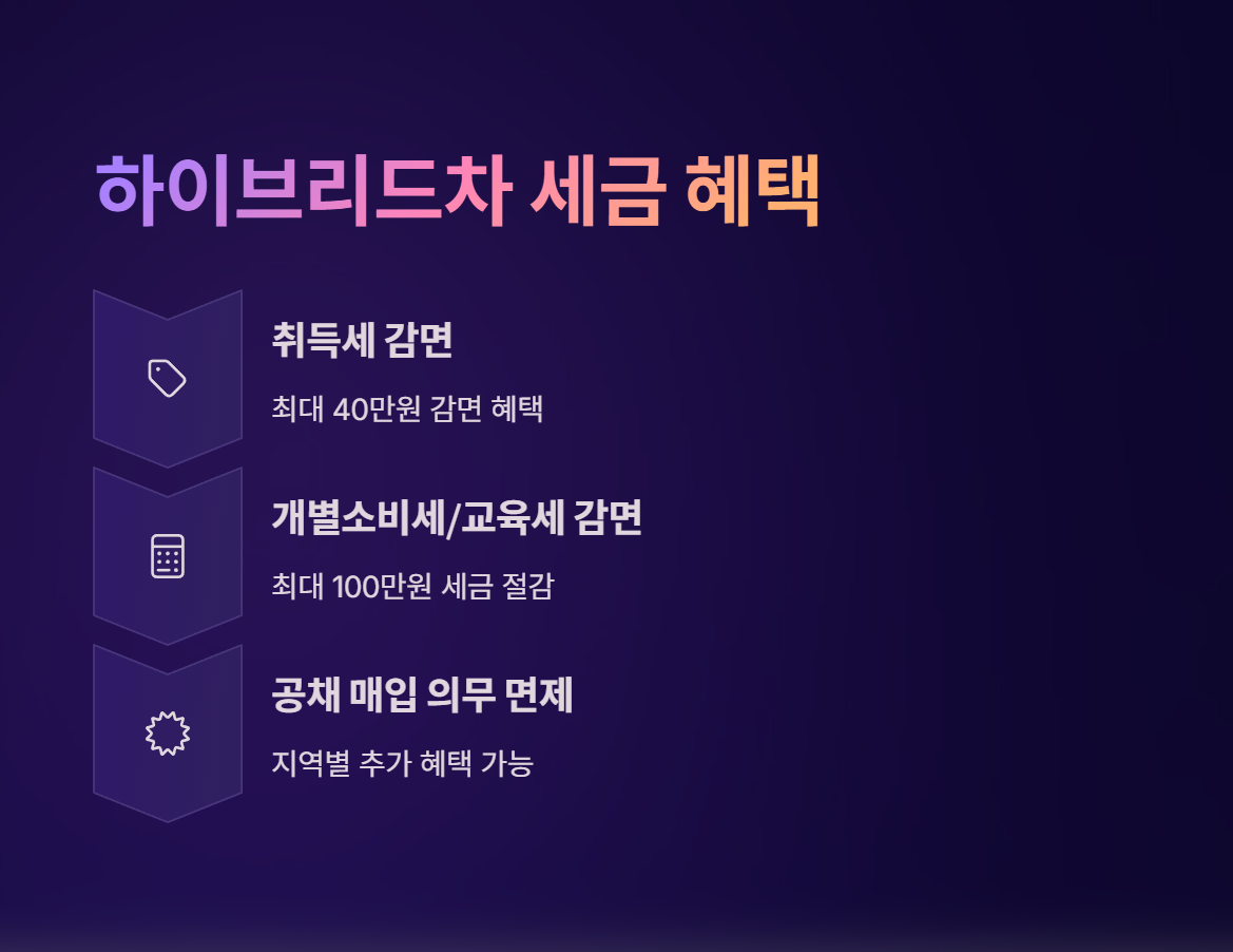 하이브리드차 구매 시 지역별로 "도시철도채권 및 지역개발채권 매입 의무"가 면제되거나 감면됩니다.