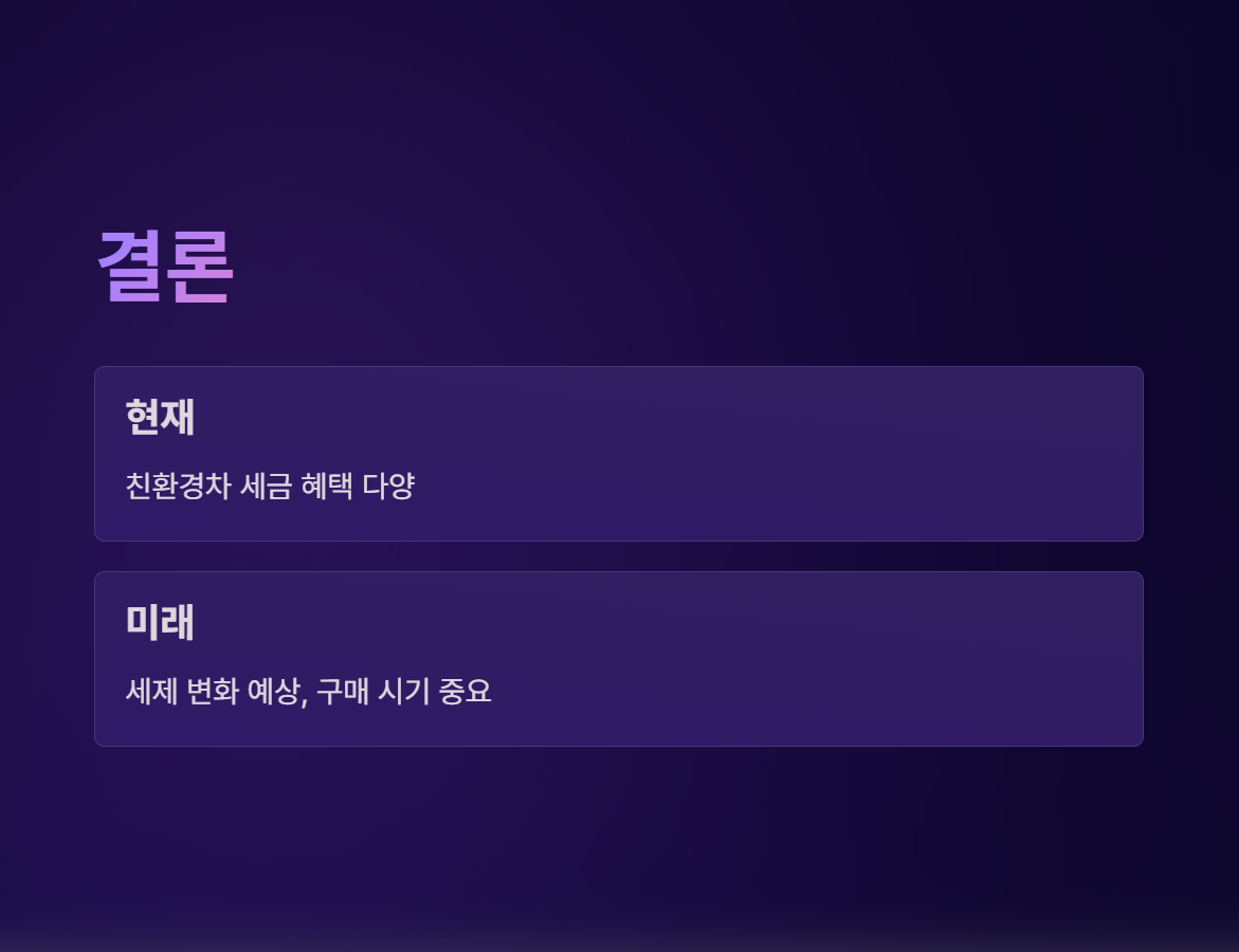 세금 혜택의 중요성보다는 차량 자체의 "경제성"과 "성능"이 더욱 부각될 수 있어요.