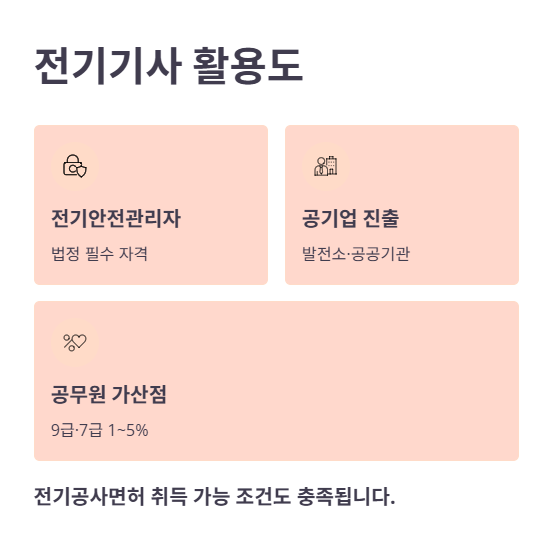 이 자격들은 모두 전기공사업, 공공기관, 건설·설비기업 취업의 핵심 기준으로 활용됩니다.
