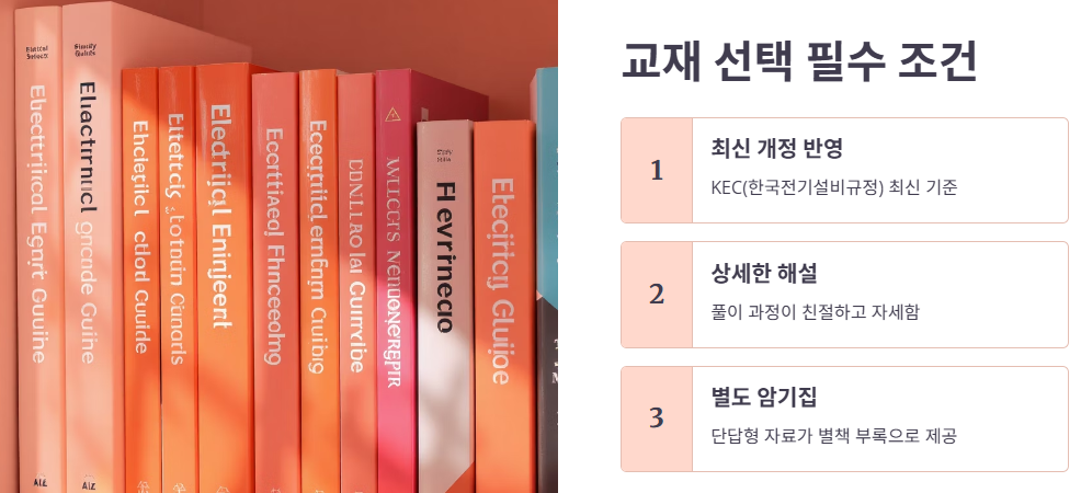 최신 개정: KEC(한국전기설비규정) 등 최신 기준이 반영된 교재인지 확인해야 합니다.