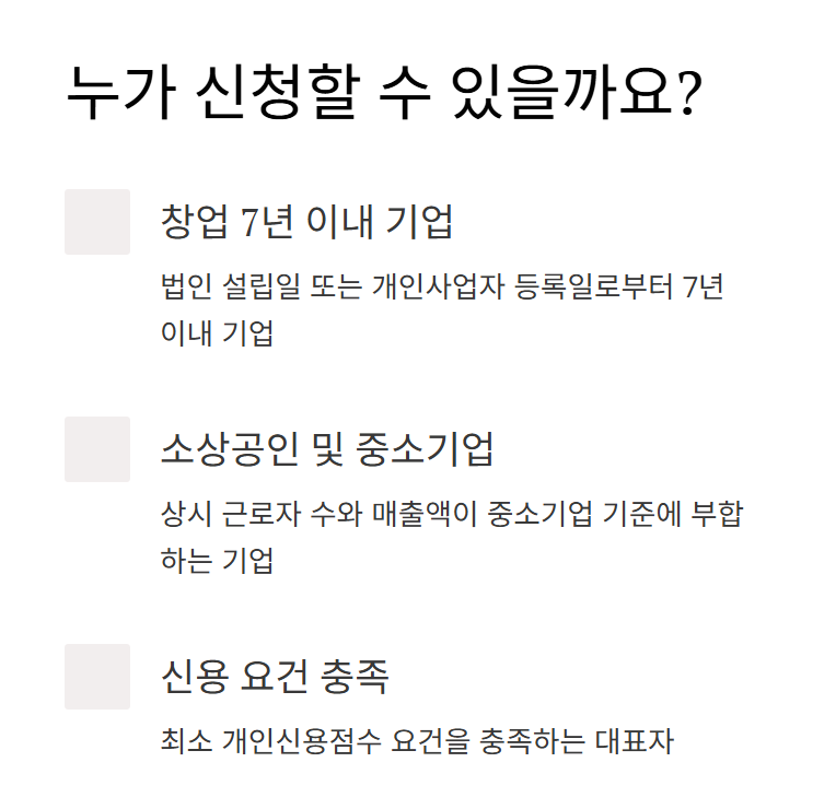 KOSME 홈페이지에서 "정확한 자격 요건"을 확인하는 것이 중요합니다.