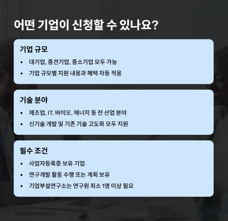 | 대상 기업 | 기업부설연구소/연구개발전담부서 보유 중소/중견기업 | 기술 기업의 필수 관문 |