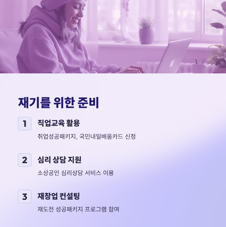 | 재기 지원 | 취업/창업 교육, 컨설팅, 전직 지원 | 폐업지원금과 연계 가능 |