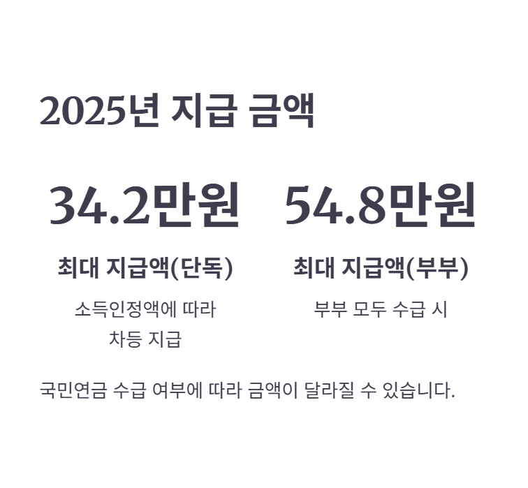 | 최대 지급액 | 단독가구 342,510원, 부부가구 548,000원 | 개인별 소득에 따라 차등 지급 |