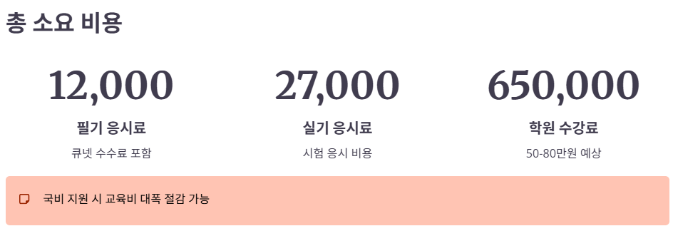 응시료: 필기시험 약 12,000원대, 실기시험 약 27,000원대 등