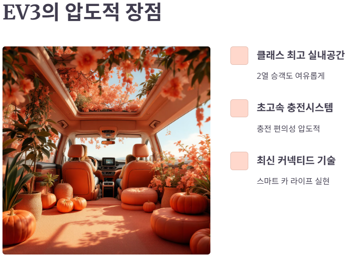 미래지향적인 디자인과 뛰어난 공간 활용성이 EV3의 가장 큰 장점입니다.