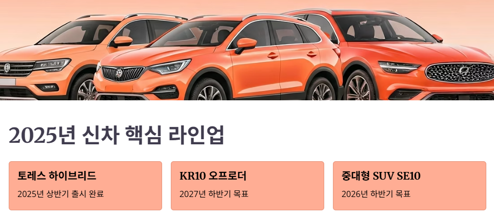 | 정통 오프로더 | KR10 (코란도 후속) | 2027년 하반기 목표 |